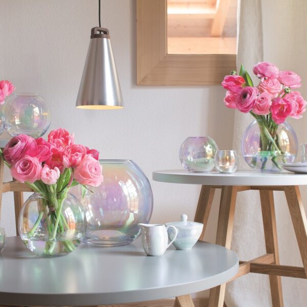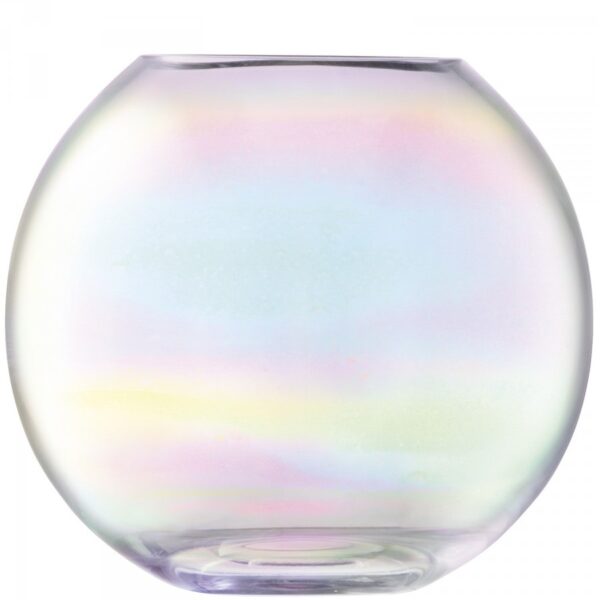 Handpainted with a sheer mother of pearl lustre, this mouthblown vase is inspired by the iridescent shimmer or pearl. Gift-boxed. Height: 11cm, Width: 12cm CARE: Handwash in warm soapy water and dry with a soft cloth.